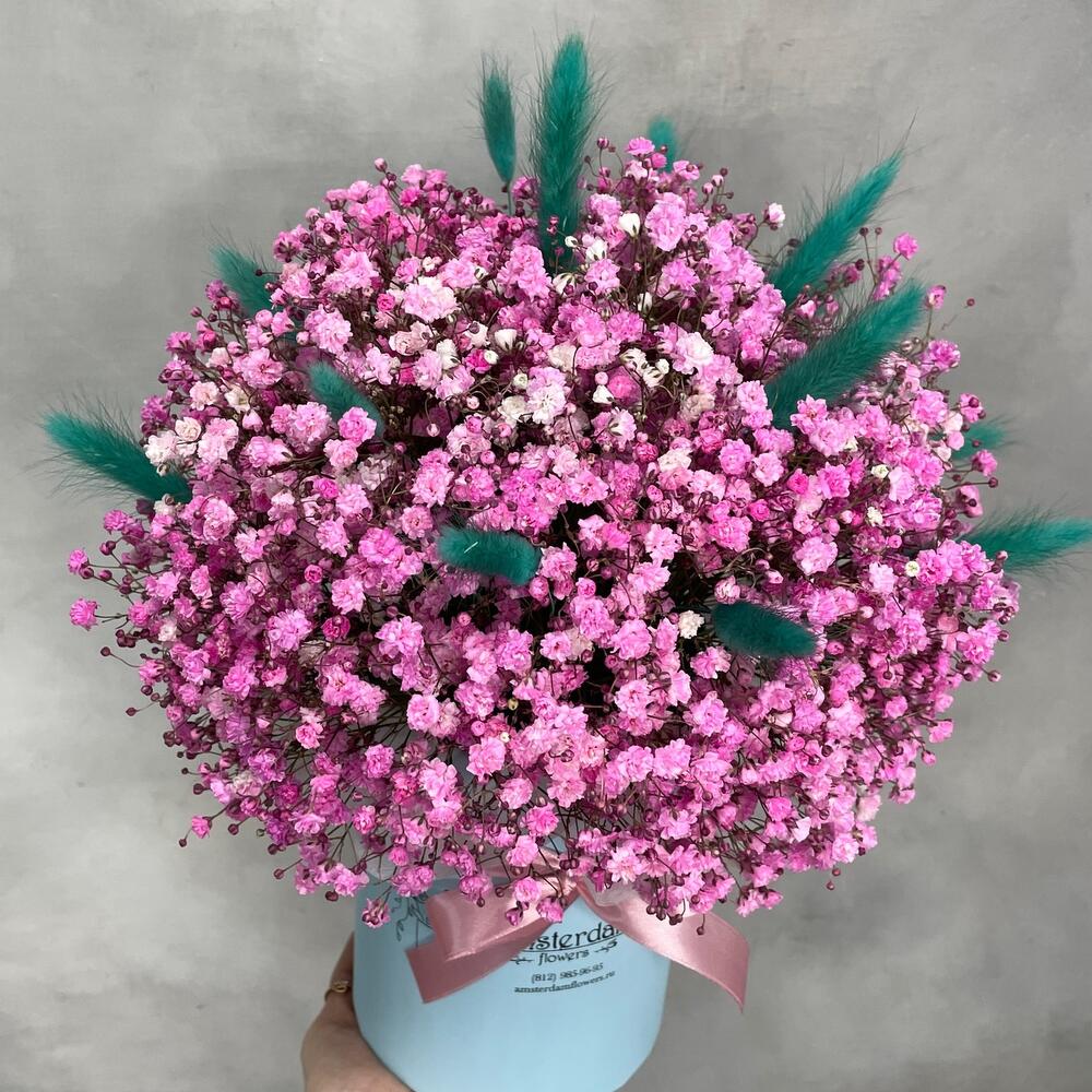 Коробка d12 – 1 шт.Оазис – 1 шт.Лагурус (сухоцвет) – 15 шт.Гипсофила – 6 шт.