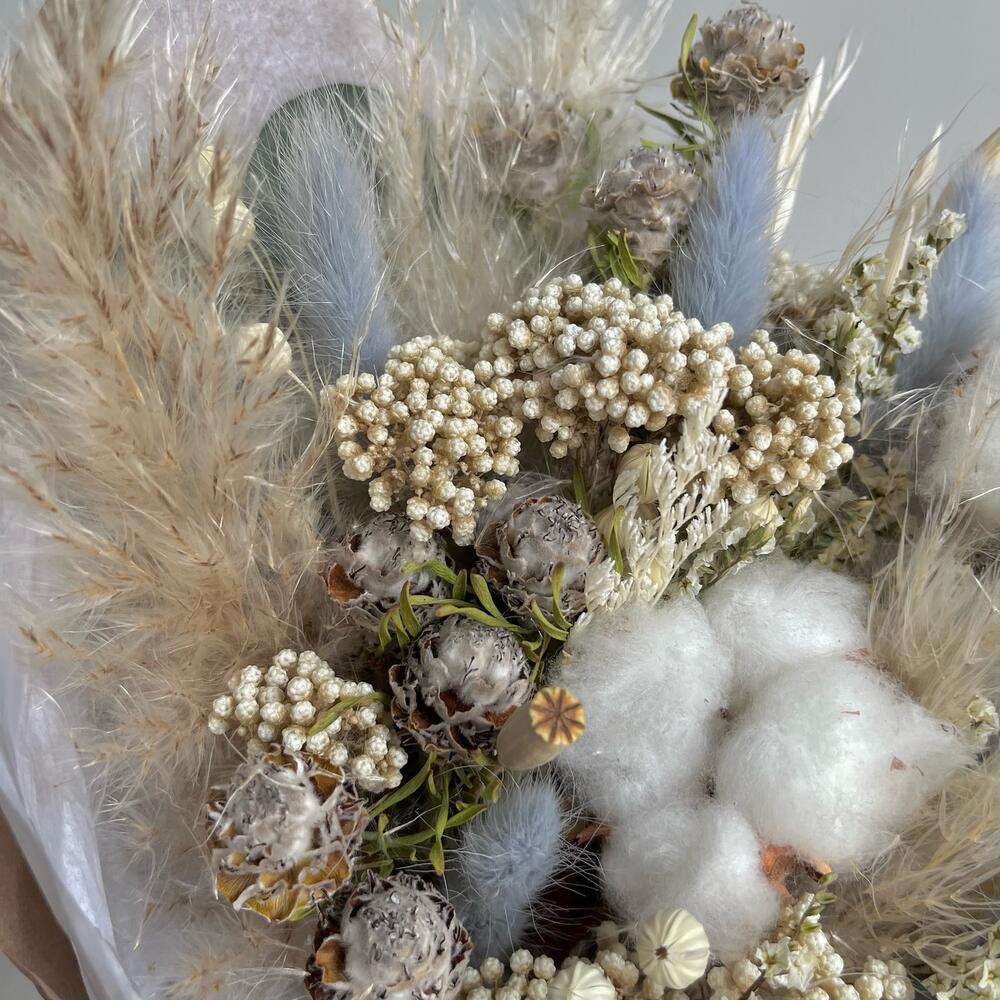 Лимониум – 1 шт.Озотамнус – 1 шт.Хлопок – 2 шт.Эвкалипт – 2 шт.Пшеница – 2 шт.Капс – 2 шт.Упаковка дизайнерская – 1 шт.Лен – 1 шт.Лагурус – 8 шт.Мак – 4 шт.Флум – 11 шт.пампасная трава – 1 шт.
