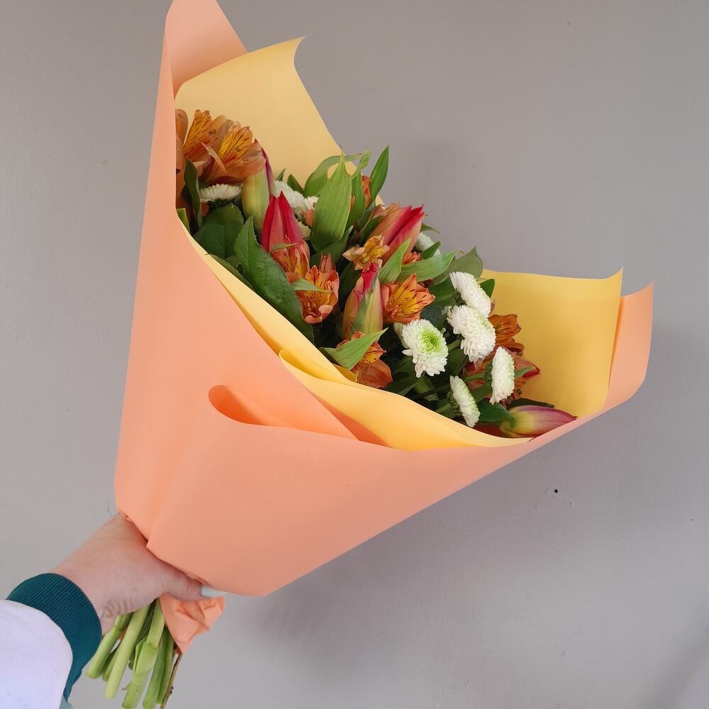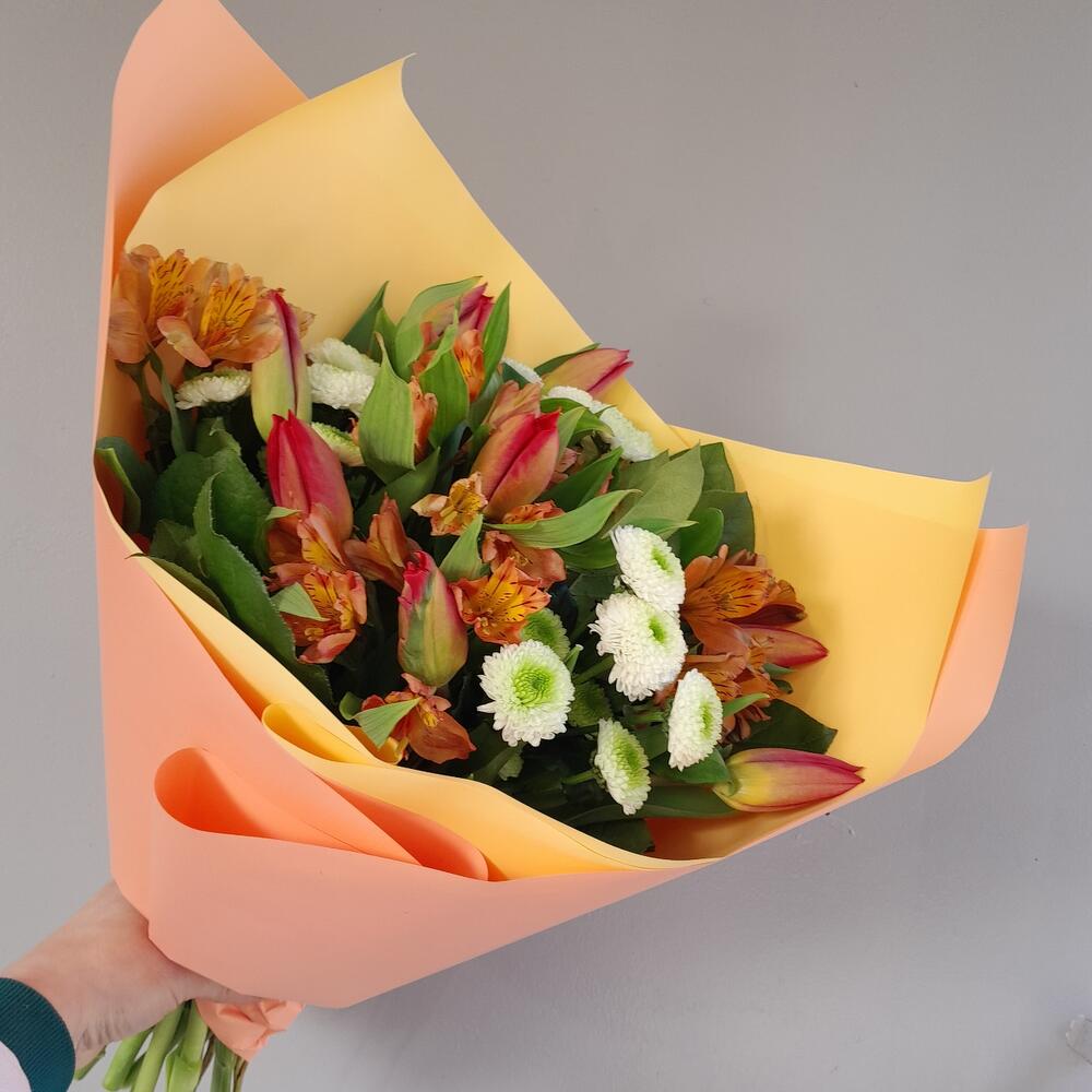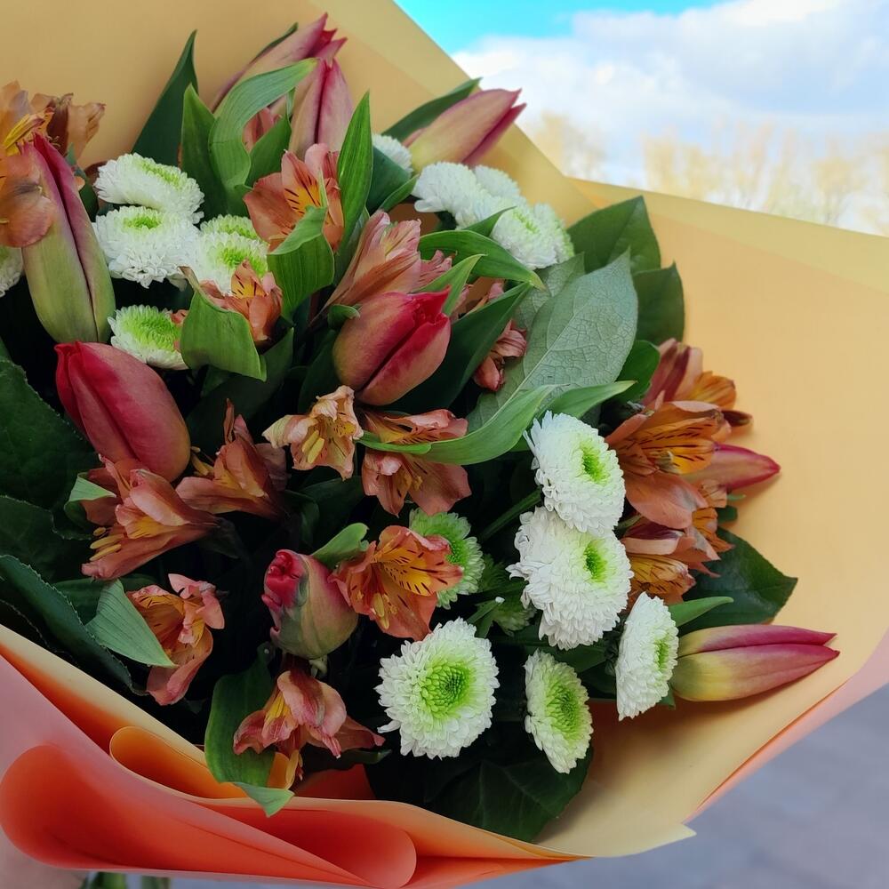 Букет из тюльпанов, альстромерии и сантини