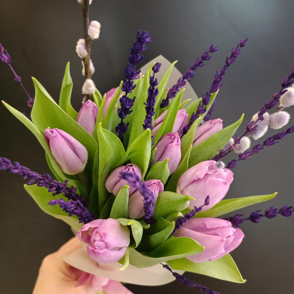 Букет с тюльпанами и лавандой
