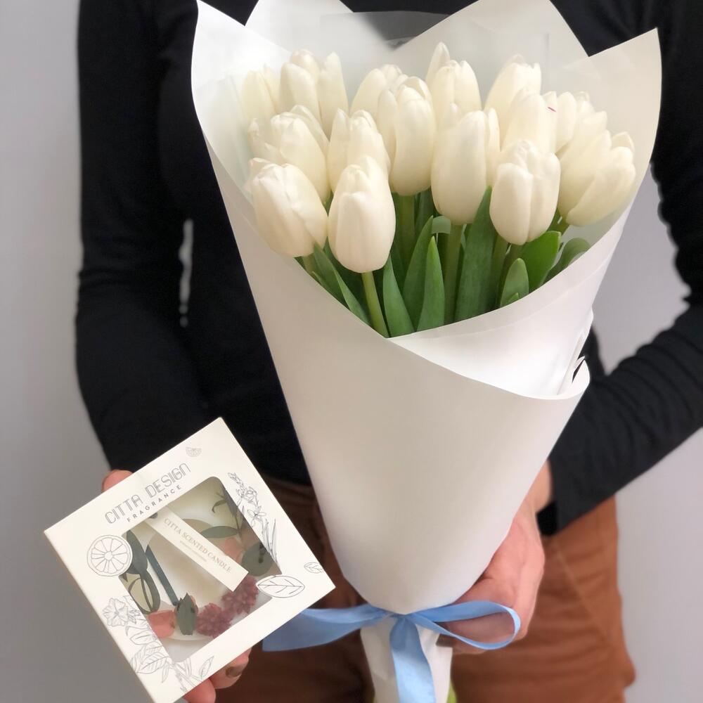 Тюльпан – 15 шт.Лента атласная – 1 шт.Упаковка дизайнерская – 1 шт.ароматическое саше – 1 шт.