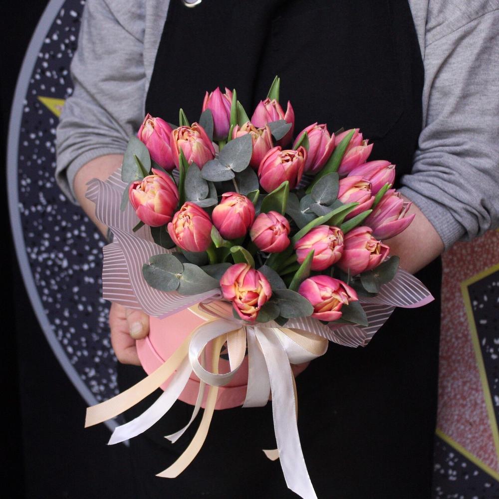тюльпан пионовидный коламбус – 19 шт.Эвкалипт – 2 шт.Пленка дизайнерская – 1 шт.Шляпная коробка – 1 шт.