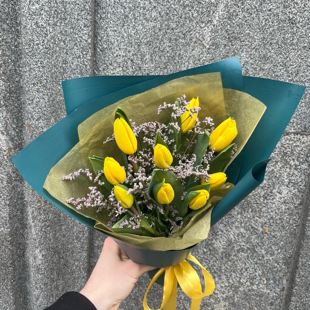 Yellow 9 тюльпанов с лимониумом